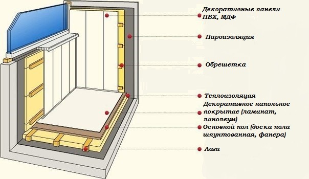 Если на балконе или лоджии установлены рамы ПВХ с заполнением стеклопакетом, то можно рассмотреть вариант отделки с утеплением. В этом случае под декоративные панели ПВХ или МДФ панели укладываются паро- и теплоизоляционные материалы. После такой отделки на лоджии можно устроить дополнительное жилое помещение.